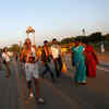 A man takes a photo as Mahesh Chaturvedi walks near the India Gate in New Delhi